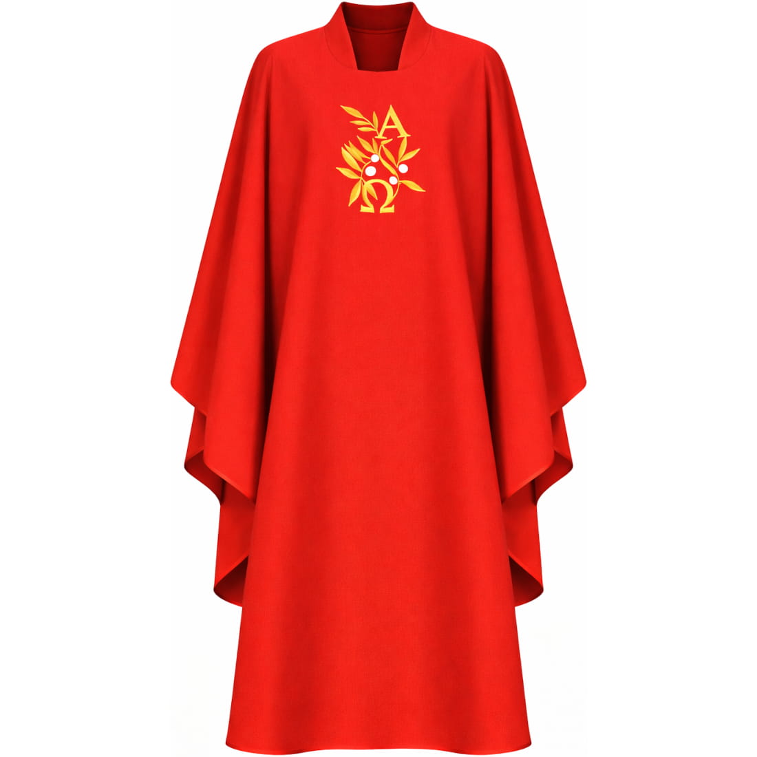 Casulla de poliéster con Alfa y Omega bordado rojo
