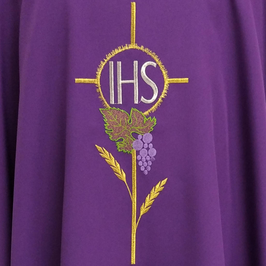 Este modelo de casulla parroquial es uno de los más baratos a la venta en nuestro catálogo de ornamentos religiosos. A pesar de ello, la casulla está bordada en la parte delantera y trasera con varios elementos religiosos: