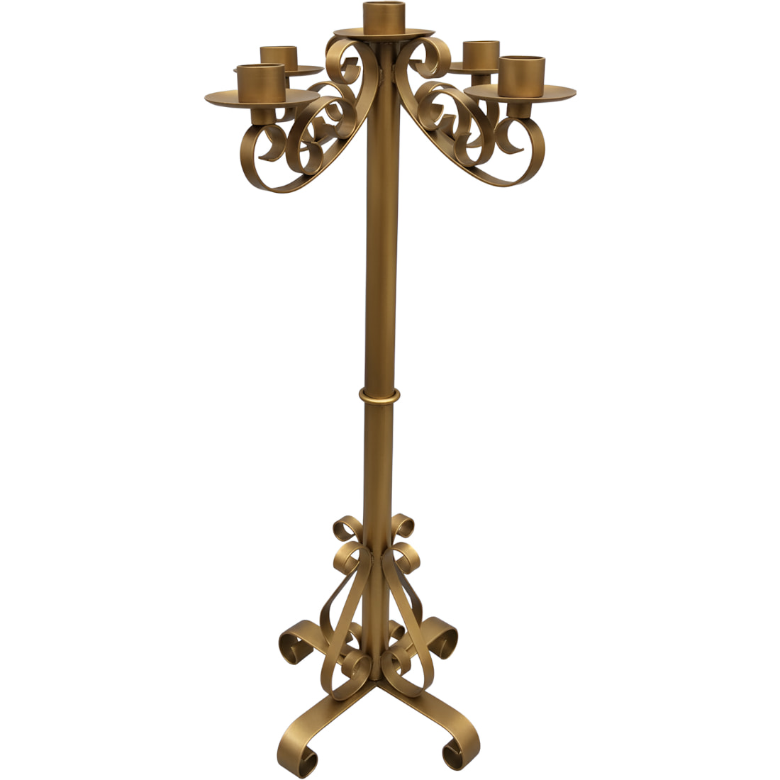 El acabado dorado armoniza con otras piezas de orfebrería religiosa. En la práctica, este candelabro de Adviento se emplea en parroquias y capillas que desean alternar, con una sola pieza, la corona de Adviento y el Cirio Pascual, reduciendo traslados y tiempos de montaje entre celebraciones.