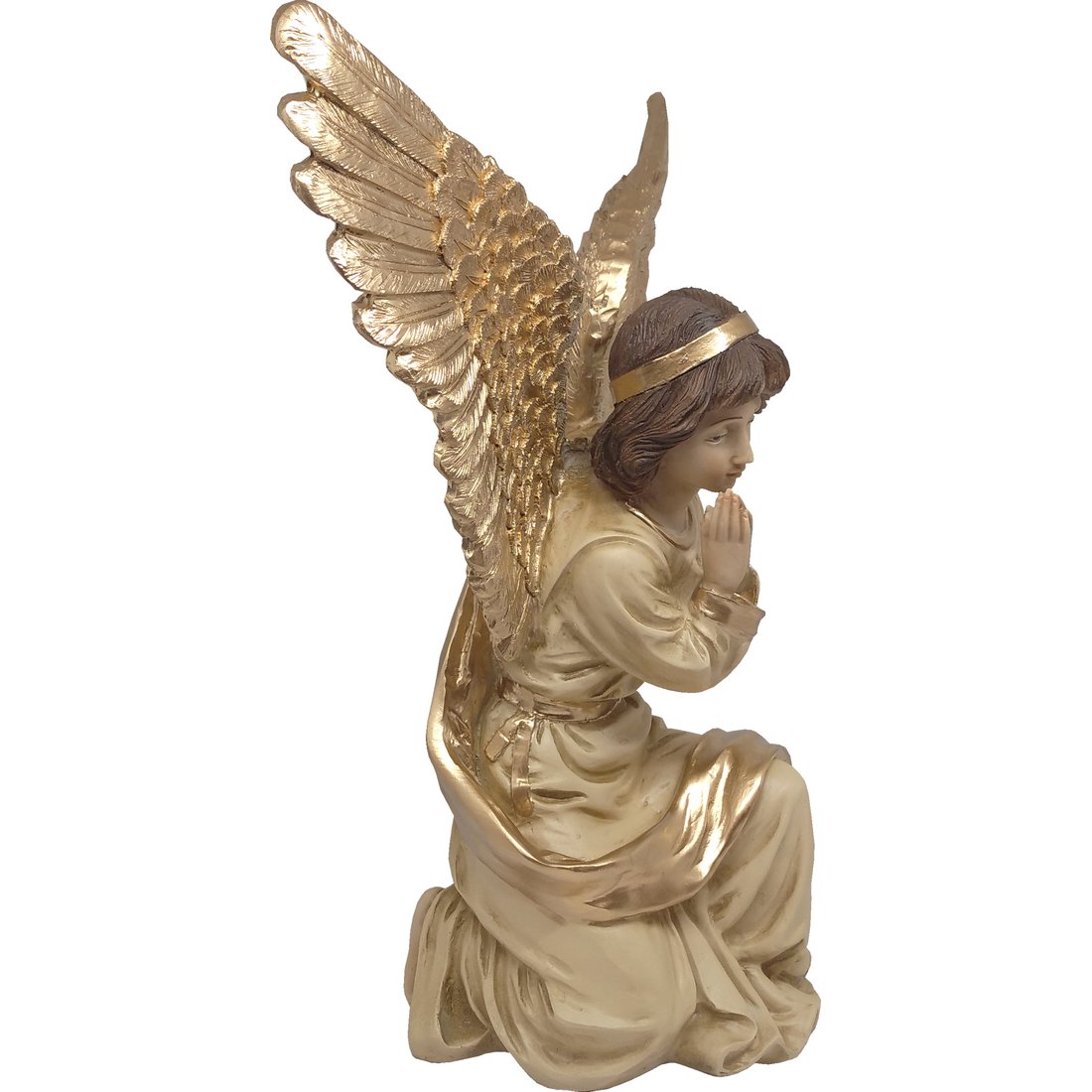 El acabado dorado de las alas realza la majestuosidad del ángel, evocando la luz celestial y la cercanía a lo divino.