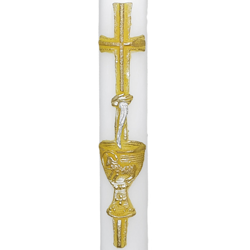 La vela de Bautismo está decorada con elementos en relieve representativos del primer Sacramento que recibimos los cristianos.