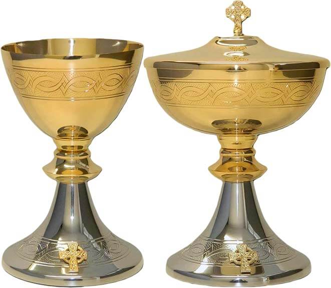 - Pie con borde alto, baño plateado y decorado con elementos cincelados y una Cruz celta en relieve. Base con 12 cm. de diámetro.