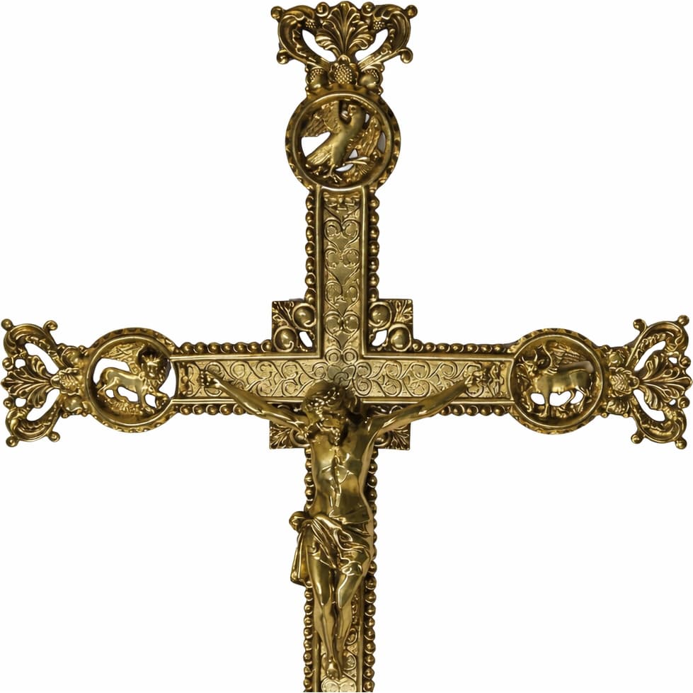 - Cruz parroquial decorada con elementos litúrgicos en relieve.