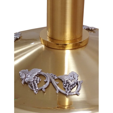Uno de ellos es una rama de vid con hojas y uvas doradas que evocan a la Eucaristía y al vino como representación de la Sangre de Cristo.