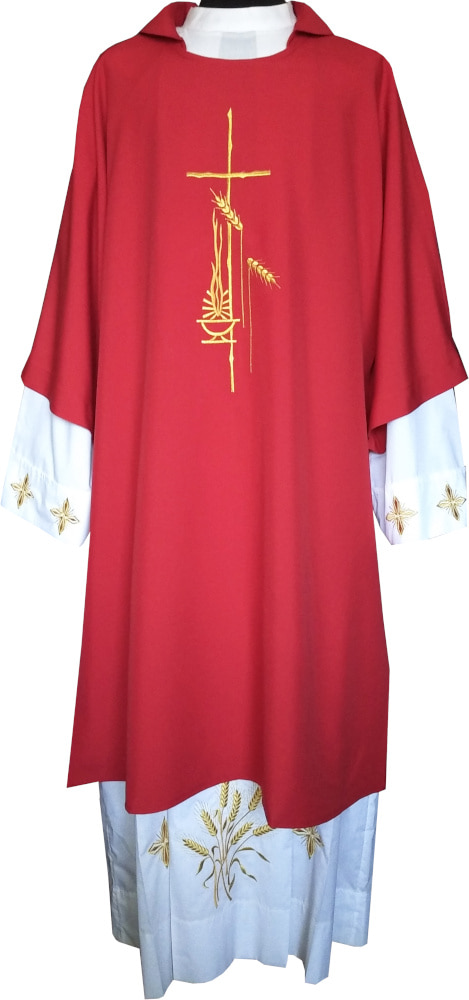 Dalmática de poliéster con Cruz y espigas bordadas rojo
