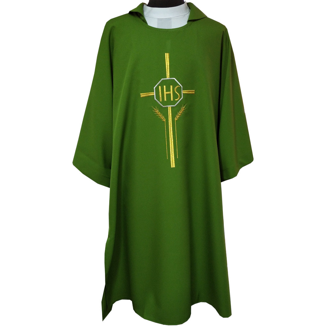Dalmática con Cruz, IHS y espigas bordadas verde