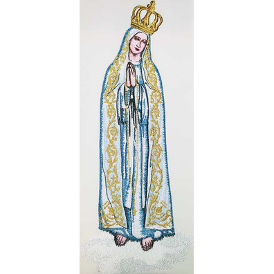 Bordado de la Virgen de Fátima con 30,50 cm. incluyendo la nube. Se representa a la Virgen de Fátima en el momento en el cual desvela los Secretos de Fátima a los tres pastores.
