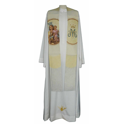 - Símbolo de la Virgen realizado con hilo dorado y azul.