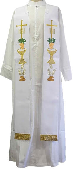 Estolón con bordados litúrgicos y fleco dorado blanco