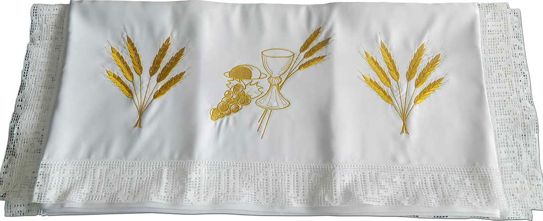 Mantel de altar con cáliz, uvas y espigas bordadas
