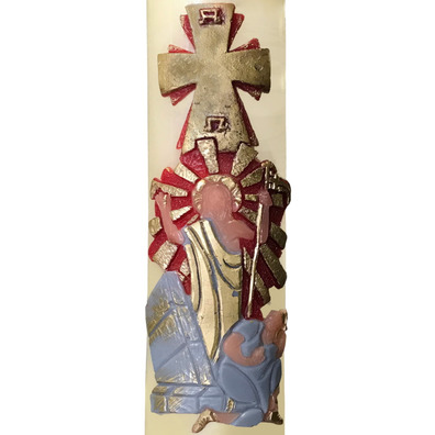 - Vela o velón para altar decorado con alfa y omega, Cruz y la figura de Cristo resucitando de entre los muertos.